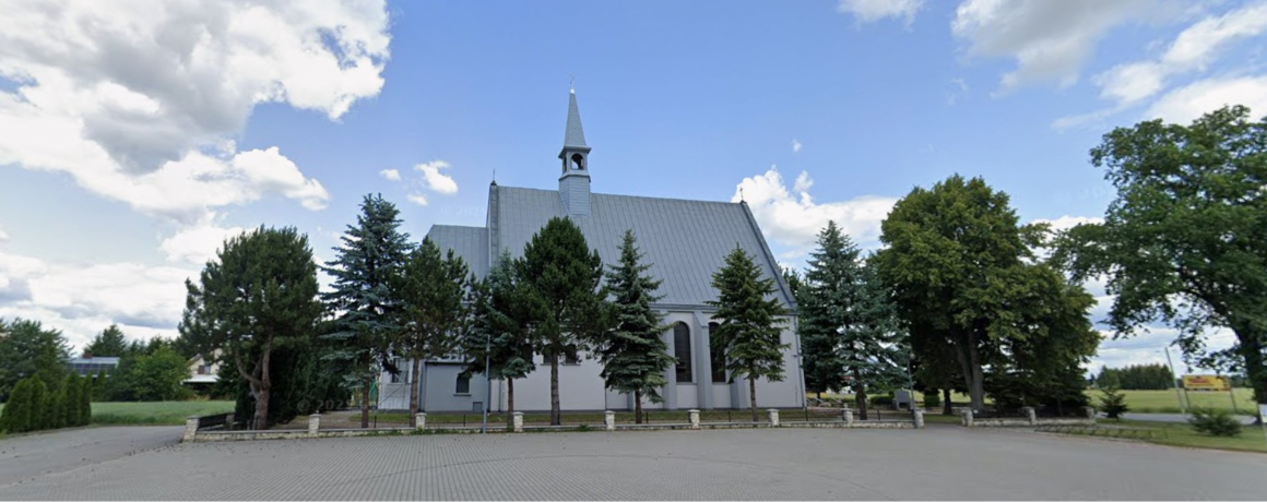 Kościół parafialny, prowizoryczny, wybudowany w latach 1926-1927, uległ zniszczeniu w czasie działań wojennych w 1944 r. Obecny kościół został wybudowany w latach 1948-1949 wg projektu Andrzeja Krzyżanowskiego. Poświęcenia dokonał bp Jan Stepa 19 XI 1950 r. Murowany z cegły z użyciem betonu, otynkowany, jednonawowy. Wnętrze nakryte sklepieniem pozornym. Ściany na zewnątrz rozczłonkowane pseudoszkarpami. W prezbiterium polichromia figuralna z ok. 1966 r., malowana przez Zbigniewa Jaskowskiego i Jerzego Lubańskiego.